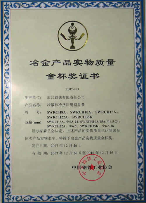含硼冷鐓和冷擠壓用鋼盤條獲冶金產(chǎn)品實(shí)物質(zhì)量金杯獎(jiǎng)