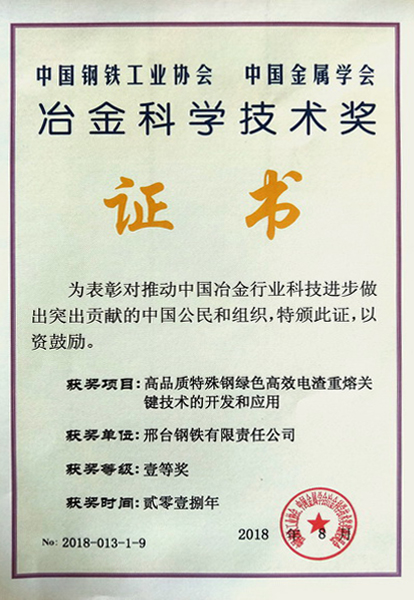 邢鋼高品質(zhì)特殊鋼綠色高效電渣重熔關鍵技術喜獲全國冶金科技一等獎