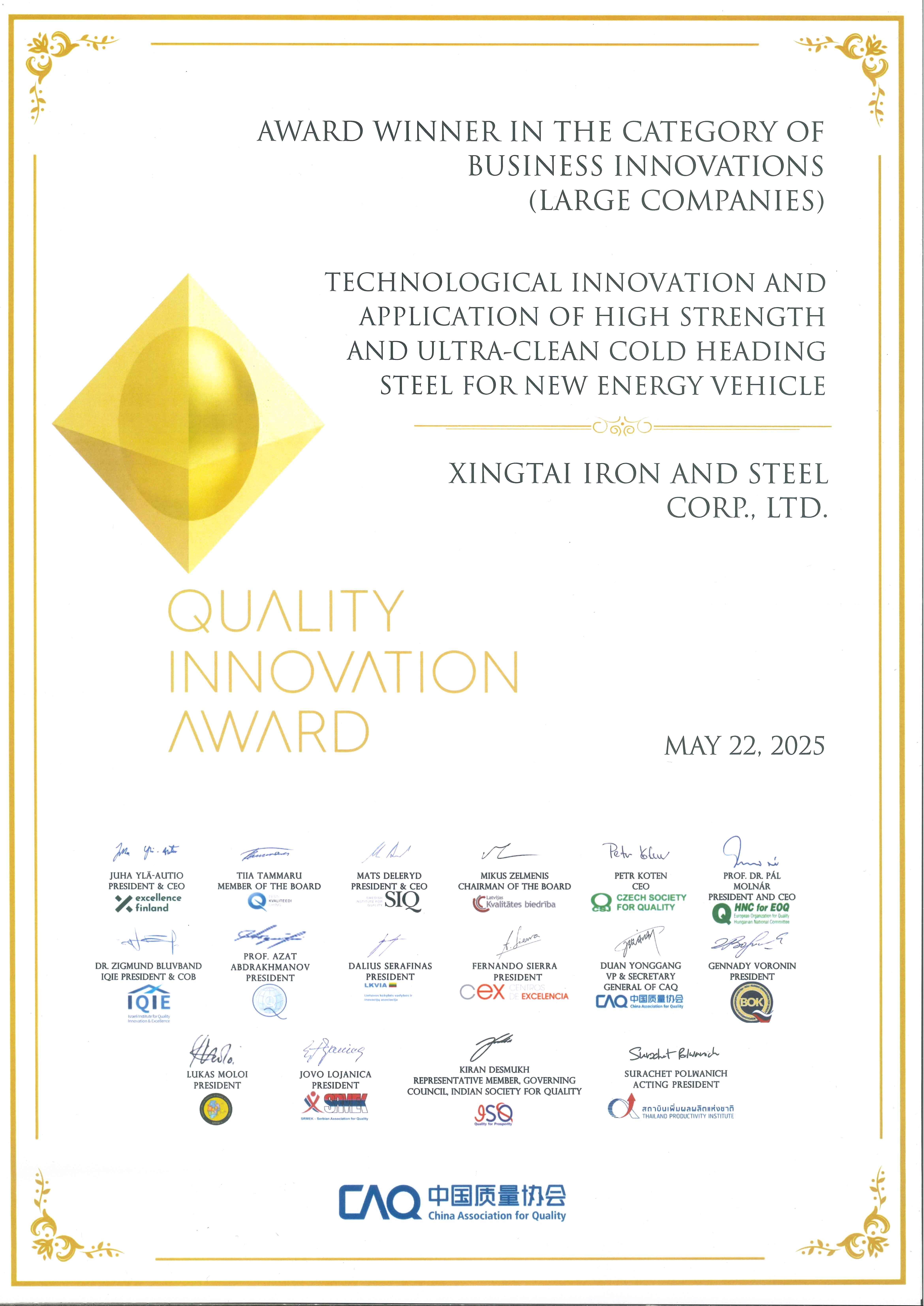 2025.5.22-23邢臺(tái)鋼鐵有限責(zé)任公司參加了在泰國舉辦的2024年國際質(zhì)量創(chuàng)新大賽發(fā)布會(huì)暨頒獎(jiǎng)儀式,邢臺(tái)鋼鐵發(fā)布的項(xiàng)目《新能源汽車用高強(qiáng)度超高潔凈度冷鐓鋼技術(shù)創(chuàng)新及應(yīng)用》榮獲該大賽一等獎(jiǎng)。這是邢鋼歷史上獲得的首個(gè)國際大獎(jiǎng),也是自國際質(zhì)量創(chuàng)新大賽舉辦以來,在鋼鐵領(lǐng)域首次獲得的國際大獎(jiǎng)。