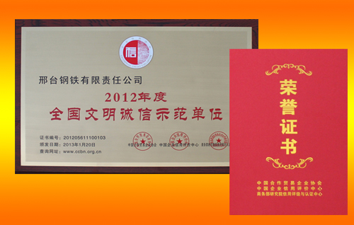 邢鋼榮獲“2012年度全國文明誠信示范單位”稱號