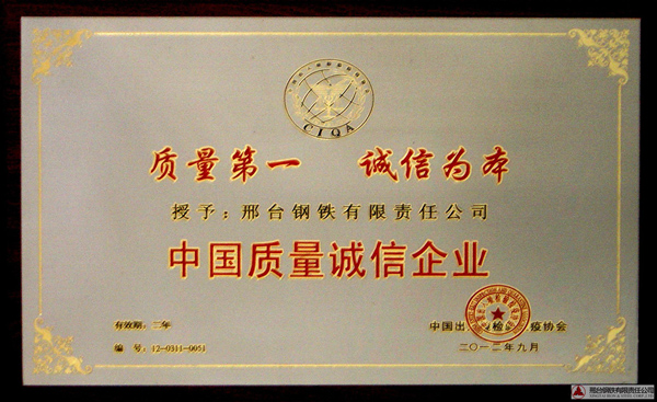 2012年9月,邢鋼被中國出入境檢驗檢疫協(xié)會評為“中國質(zhì)量誠信企業(yè)”,并頒發(fā)獎牌。