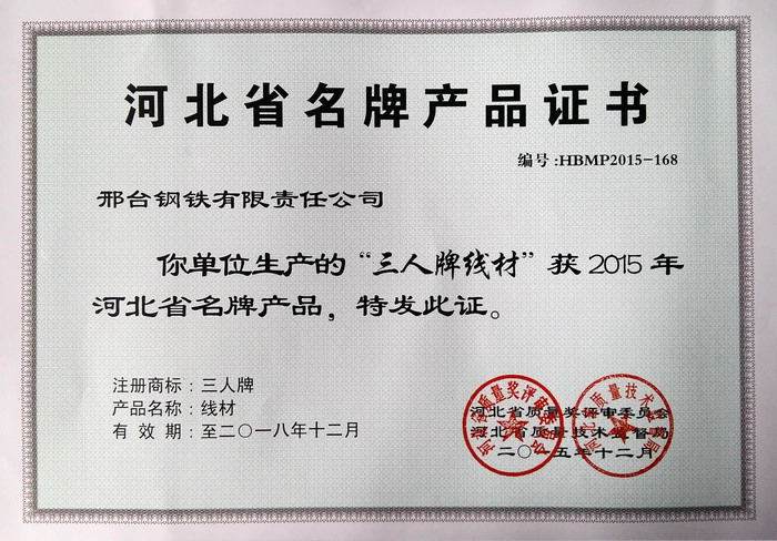 - 近日,邢鋼獲得了“河北省名牌產(chǎn)品”新證書,證書有效期至2018年12月。去年4月邢鋼按照河北省質(zhì)量技術(shù)監(jiān)督局的通知要求再次申報(bào)復(fù)評(píng),提交了申報(bào)材料,經(jīng)邢臺(tái)市技術(shù)質(zhì)量監(jiān)督局推薦、第三方專業(yè)評(píng)價(jià)、用戶滿意度測評(píng)、省質(zhì)量獎(jiǎng)評(píng)審委員會(huì)審議、社會(huì)公示并報(bào)請(qǐng)省政府批準(zhǔn),邢鋼“三人牌線材”再獲“河北省名牌產(chǎn)品”。