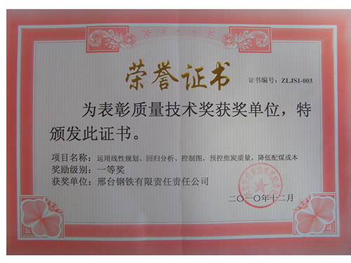 - 近日獲悉,我公司申報(bào)的“運(yùn)用線(xiàn)性規(guī)劃、回歸分析、控制圖預(yù)控焦炭質(zhì)量,降低配煤成本”質(zhì)量技術(shù)成果,經(jīng)河北省質(zhì)量技術(shù)獎(jiǎng)勵(lì)委員會(huì)評(píng)選,獲得一等獎(jiǎng)。該項(xiàng)目是焦化廠(chǎng)運(yùn)用質(zhì)量統(tǒng)計(jì)技術(shù)工具經(jīng)過(guò)實(shí)踐取得的一項(xiàng)質(zhì)量技術(shù)成果。通過(guò)實(shí)施該項(xiàng)目,配合煤成本比2008年降低了4775萬(wàn)元,保持了焦炭質(zhì)量的持續(xù)穩(wěn)定。