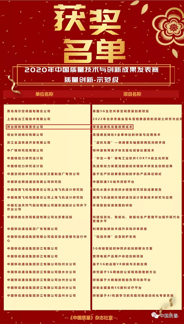 - 邢鋼獲得“中國質(zhì)量技術(shù)與創(chuàng)新成果發(fā)表賽”多項(xiàng)榮譽(yù)