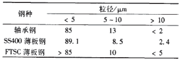 通常認為鋼中粒徑在1-50μm的非金屬夾雜物都屬于顯微夾雜物。對于高品質(zhì)特殊用途鋼種,鋼中粒徑小于10μm的顯微夾雜物占有非常大的比例。表l為國內(nèi)幾種特殊鋼中顯微夾雜物的粒徑分布。