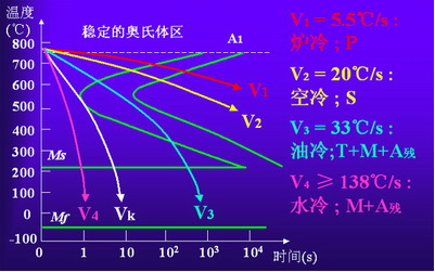等溫轉(zhuǎn)變“TTT曲線”在連續(xù)冷卻轉(zhuǎn)變中的應(yīng)用:由于連續(xù)冷卻“CCT轉(zhuǎn)變曲線”的測定較為困難,而連續(xù)冷卻轉(zhuǎn)變可以看作由許多溫度相差很小的等溫轉(zhuǎn)變過程所組成的,所以連續(xù)冷卻轉(zhuǎn)變得到的組織可認為是不同溫度下等溫轉(zhuǎn)變產(chǎn)物的混合物。故生產(chǎn)中常用TTT曲線(C曲線)近似地分析連續(xù)冷卻過程。下圖中V1(爐冷)、V2(空冷)、V3(油冷)、V4(水冷)代表熱處理中四種常用的連續(xù)冷卻方式。