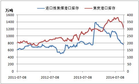 據(jù)我的鋼鐵網(wǎng)監(jiān)測,截至10月10日日照港、連云港、天津港焦炭庫存合計(jì)303.7萬噸,自8月8日達(dá)到380.6萬噸的年內(nèi)最高位之后,港口庫存處于持續(xù)下滑態(tài)勢。不過,國內(nèi)鋼企焦炭庫存仍保持低位,并無明顯補(bǔ)庫意愿,導(dǎo)致焦炭價(jià)格暫穩(wěn)運(yùn)行,一旦后期鋼價(jià)持續(xù)堅(jiān)挺,或推動鋼企入市采購。