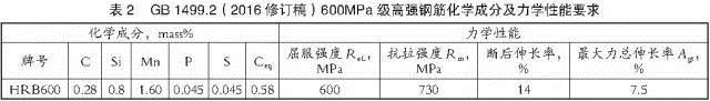 目前國內(nèi)有沙鋼、承鋼和濟(jì)鋼等鋼廠具備成功生產(chǎn)600MPa級熱軋螺紋鋼筋的經(jīng)驗(yàn)。表2為GB l499.2(2016修訂稿)對600MPa級高強(qiáng)鋼筋HRB600化學(xué)成分和力學(xué)性能的要求。