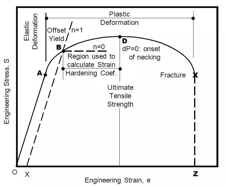 拉伸試驗是最采用的力學(xué)性能測試試驗,通過拉伸曲線我們可以獲得一系列的材料力學(xué)性能參數(shù)。那么從拉伸曲線上我們參提取出來哪些有用的信息呢?