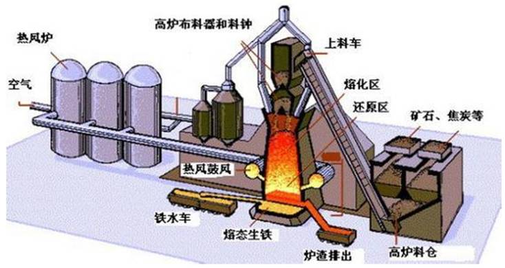 高爐生產(chǎn)過程就是將鐵礦石在高溫下冶煉成生鐵的過程。從爐頂裝入鐵礦石、焦炭、造渣用熔劑(石灰石),從位于爐子下部沿爐周的風口吹入預熱的空氣。在高溫下,焦炭中的碳(有的高爐也噴吹煤粉、重油、天然氣等輔助燃料)同鼓入空氣中的氧發(fā)生燃燒反應,產(chǎn)生高溫和還原性氣體,這些還原性氣體在上升過程中加熱緩慢下行的爐料,并將鐵礦石中的鐵氧化物還原成金屬鐵。