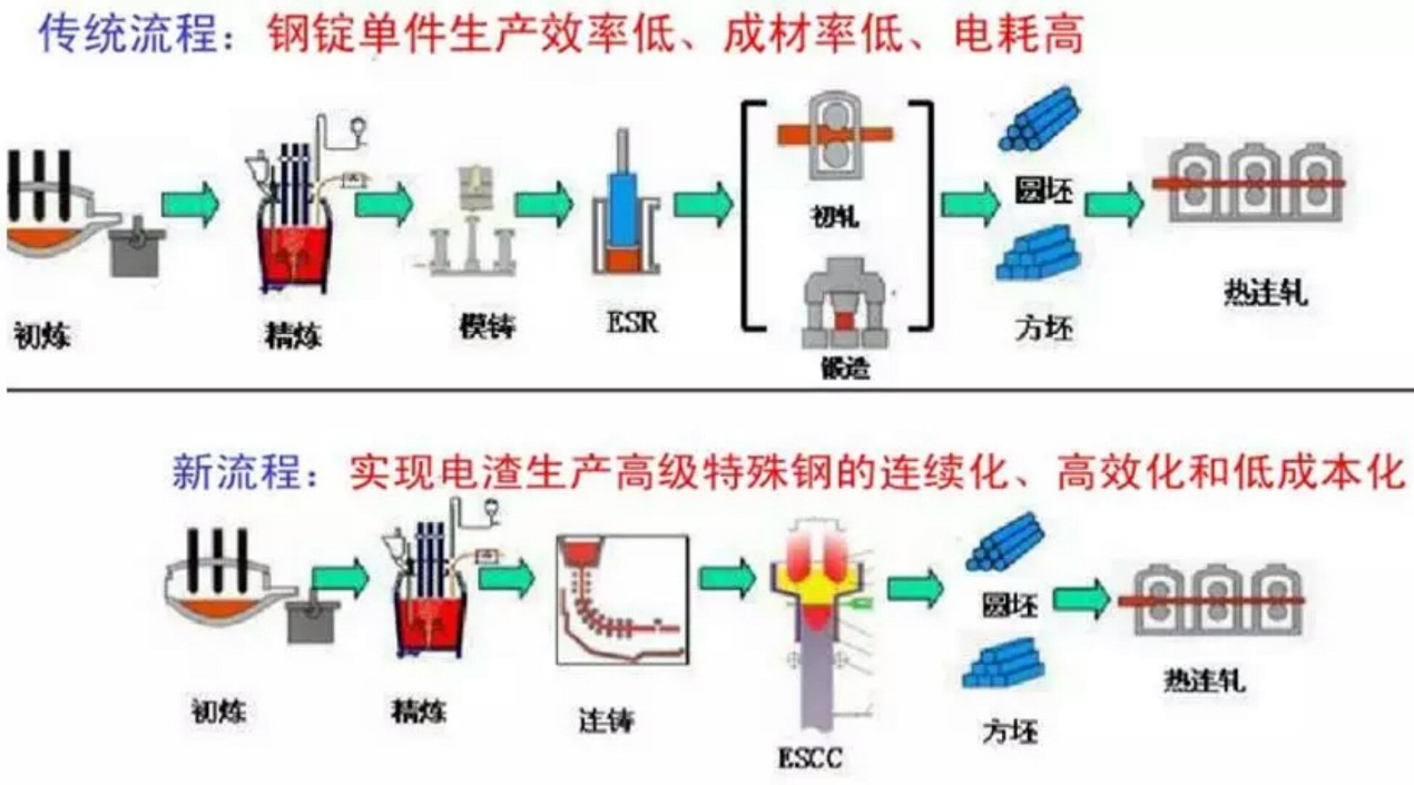 為解決電渣重熔技術電耗較高、批量少管理不便、生產效率低等局限性特點,冶金工作者也在不斷的創(chuàng)新和完善電渣重熔技術,如電渣連鑄技術: