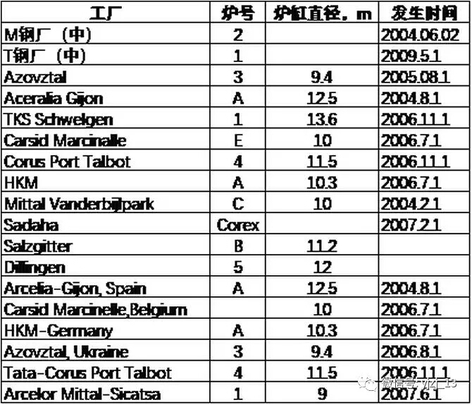 以下針對(duì)國(guó)內(nèi)外典型高爐爐缸燒出案例進(jìn)行統(tǒng)計(jì),并對(duì)燒出原因、修復(fù)和維護(hù)等方面進(jìn)行詳細(xì)的說(shuō)明,為國(guó)內(nèi)外高爐的長(zhǎng)壽提供技術(shù)和數(shù)據(jù)參考。