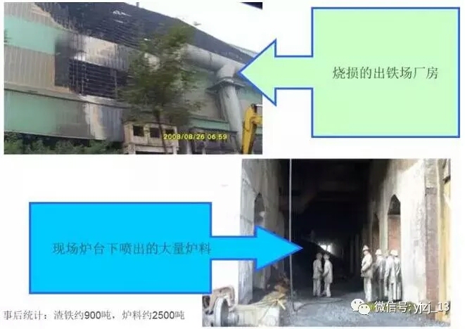事后確認(rèn):4#鐵口下方爐缸燒穿,大量渣鐵和炙熱的爐料(焦炭、礦石)噴出,現(xiàn)場(chǎng)燒損嚴(yán)重(新3高爐本體電纜、煤粉噴吹總線電纜、新2高爐電源電纜、計(jì)量?jī)x表電纜、出鐵場(chǎng)天棚、4#爐前炮、開(kāi)口機(jī)、東場(chǎng)及北場(chǎng)爐前吊車(chē)、爐前休息室、電梯等燒損。)