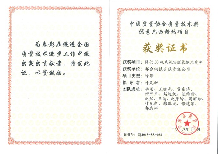為推廣應(yīng)用六西格瑪?shù)膬?yōu)秀成果,交流、學(xué)習(xí)先進(jìn)典型,促進(jìn)六西格瑪項(xiàng)目水平的提升,邢鋼參加了2018年中國(guó)質(zhì)量協(xié)會(huì)質(zhì)量技術(shù)獎(jiǎng)六西格瑪優(yōu)秀項(xiàng)目申報(bào)。近日獲悉,公司申報(bào)的兩個(gè)六西格瑪項(xiàng)目,均榮獲了2018年中國(guó)質(zhì)量協(xié)會(huì)六西格瑪優(yōu)秀項(xiàng)目獎(jiǎng)。獲獎(jiǎng)項(xiàng)目分別是煉鋼廠(chǎng)主導(dǎo)的《降低50噸系統(tǒng)鋁脫氧甩廢率》項(xiàng)目和技術(shù)中心主導(dǎo)的《降低三線(xiàn)SWRCH35K、SWRCH45K鋼種(Φ20-24mm規(guī)格)裂紋率》項(xiàng)目。