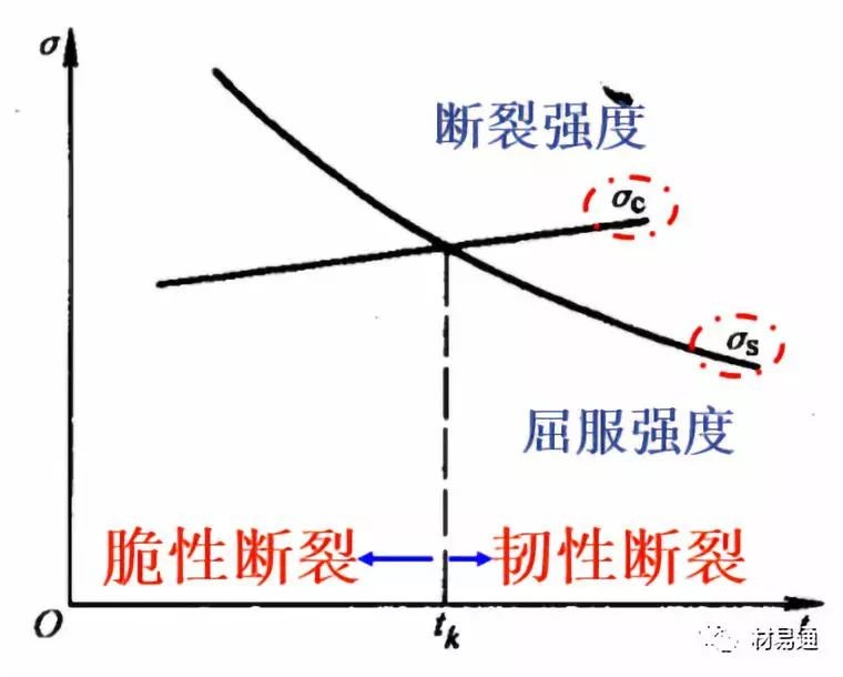 低溫脆性是材料屈服強度隨著溫度的降低急劇增加的結(jié)果;見右圖,屈服點隨著溫度的下降而升高,但材料的斷裂強度隨著溫度的變化很?。粌删€交點對應的溫度就是tk。