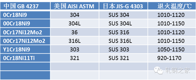 奧氏體不銹鋼的代表鋼種是 18-8 鋼(304),因?yàn)槭菉W氏體組織,所以具有無磁性 且沒有淬硬性等特點(diǎn)。由于該鋼種不發(fā)生相變,其熱處理就是加熱到高溫(一般在1000℃以上),奧氏體再結(jié)晶的同時,使在加工中產(chǎn)生的碳化物和。相分解物固溶到奧 氏體中,然后快速冷卻,使碳呈固溶狀態(tài)的奧氏體保持到常溫,這―處理過程即為固溶處理。表 1 為奧氏體不銹鋼的參考退火溫度。