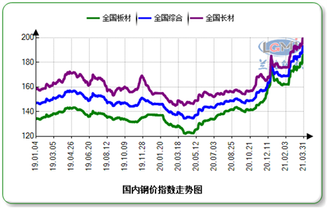 一季度,在需求提振、成本支撐、環(huán)保加碼、國(guó)內(nèi)外大宗商品整體上漲帶動(dòng)下,國(guó)內(nèi)鋼鐵市場(chǎng)震蕩上行,據(jù)蘭格鋼鐵云商平臺(tái)監(jiān)測(cè)數(shù)據(jù)顯示,一季度,蘭格鋼鐵綜合鋼材價(jià)格指數(shù)均值為177,同比上升22.5%;長(zhǎng)材價(jià)格指數(shù)為184.2,同比上升22.5%;板材價(jià)格指數(shù)為169.7,同比上升29.0%。從鋼材均價(jià)來看,一季度蘭格鋼鐵綜合鋼材均價(jià)為4868元/噸,較上年同期上漲同比上漲977元/噸,同比上漲25.1%。
