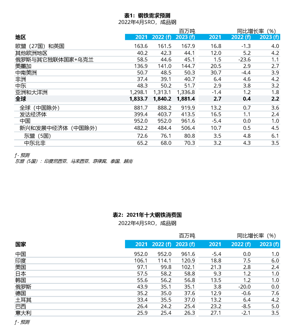在發(fā)展中經濟體,隨著疫情大流行影響的持續(xù)和通貨膨脹的爆發(fā),以及因此造成的許多新興經濟體進入緊縮銀根周期,發(fā)展中經濟體的復蘇過程面臨更多挑戰(zhàn)。發(fā)展中經濟體(中國除外)的鋼鐵需求繼2020年下降7.7%之后,2021年增長了10.7%,這一數字略高于我們之前的預測。2022年和2023年,新興經濟體將繼續(xù)面臨外部環(huán)境的不斷惡化、俄烏戰(zhàn)爭、美國緊縮銀根等帶來的挑戰(zhàn),這些挑戰(zhàn)將導致新興經濟體在2022年和2023年出現低速增長,分別為0.5%和4.5%。