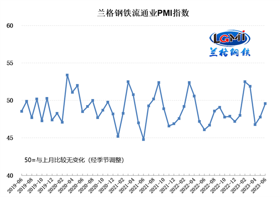 蘭格鋼鐵網(wǎng)統(tǒng)計發(fā)布的2023年6月份鋼鐵流通業(yè)PMI總指數(shù)為49.6%,比上月上升1.8個百分點,在收縮區(qū)間內(nèi)繼續(xù)回升。從分類指數(shù)看,構(gòu)成鋼鐵流通業(yè)PMI的10個分類指數(shù)6升3降1平,其中銷售量、銷售價格、總訂單量、采購成本、走勢判斷和采購意愿6項指數(shù)上升,到貨速度、庫存水平和融資環(huán)境3項指數(shù)下降,企業(yè)雇員1項指數(shù)持平。