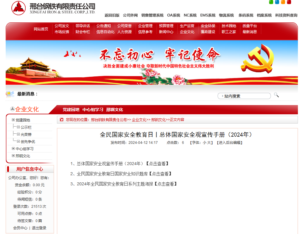 國家安全是民族復(fù)興的根基,社會穩(wěn)定是國家強盛的前提。4月15日是第九個全民國家安全教育日,為加強全民國家安全意識,提升維護和抵御安全風險能力,近日,邢鋼在全公司范圍內(nèi)組織開展了“全民國家安全教育日”普法宣傳活動。