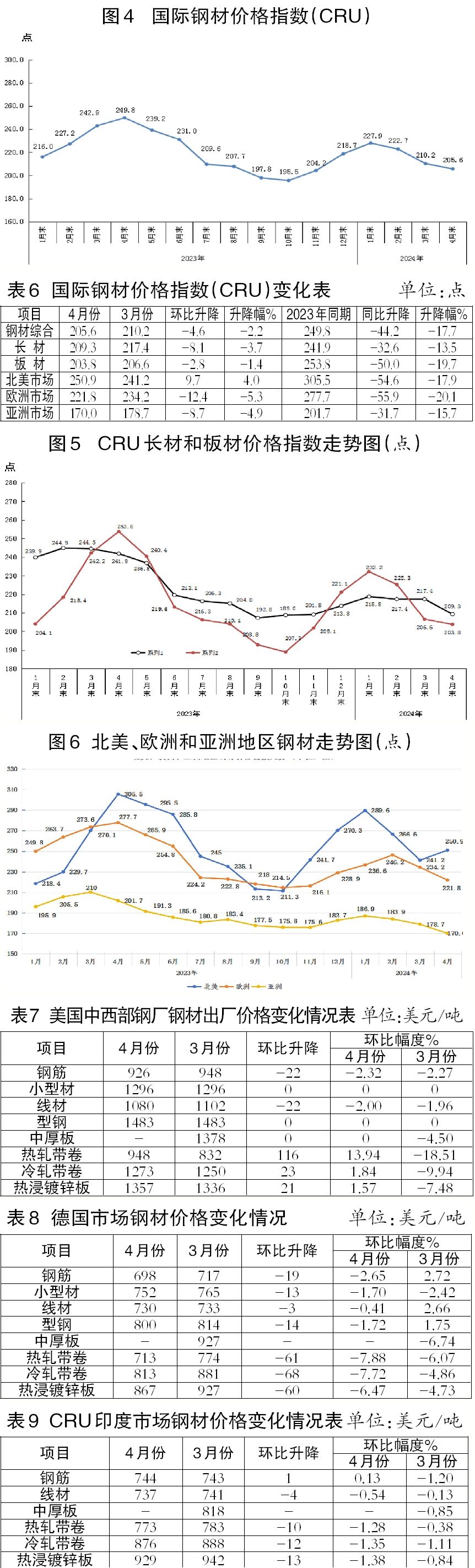 4月份,CRU國際鋼材價格指數(shù)為205.6點,環(huán)比下降4.6點,降幅為2.2%,連續(xù)3個月下降;同比下降44.2點,降幅為17.7%。