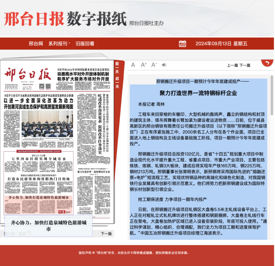 邢鋼搬遷升級項(xiàng)目總投資132億元,是省“十四五”規(guī)劃重大項(xiàng)目中制造業(yè)現(xiàn)代化水平提升重大工程、省重點(diǎn)項(xiàng)目、市重大產(chǎn)業(yè)項(xiàng)目,主要包括煉鐵、煉鋼、軋鋼3大板塊,建成后將實(shí)現(xiàn)年產(chǎn)鐵165萬噸、鋼225萬噸、鋼材213萬噸。邢鋼董事長張育明表示,新邢鋼將采用國際先進(jìn)的“熔融還原+電爐”短流程工藝,實(shí)現(xiàn)優(yōu)特鋼品種的高端化和綠色化制造,對我國鋼鐵行業(yè)發(fā)展具有創(chuàng)新引領(lǐng)示范意義。他們將努力把新邢鋼建設(shè)成為國際特鋼長材創(chuàng)新型引領(lǐng)企業(yè)。