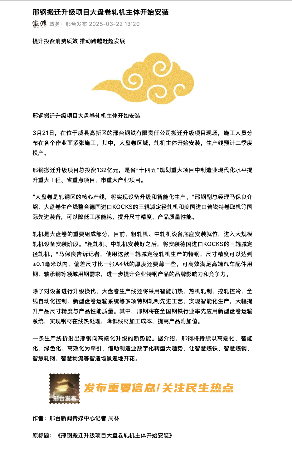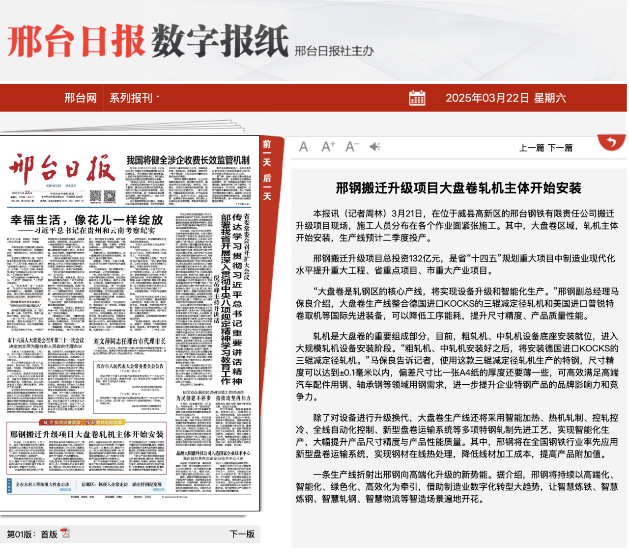 邢鋼搬遷升級(jí)項(xiàng)目總投資132億元,是省“十四五”規(guī)劃重大項(xiàng)目中制造業(yè)現(xiàn)代化水平提升重大工程、省重點(diǎn)項(xiàng)目、市重大產(chǎn)業(yè)項(xiàng)目。 “大盤(pán)卷是軋鋼區(qū)的核心產(chǎn)線(xiàn),將實(shí)現(xiàn)設(shè)備升級(jí)和智能化生產(chǎn)。”邢鋼副總經(jīng)理馬保良介紹,大盤(pán)卷生產(chǎn)線(xiàn)整合德國(guó)進(jìn)口KOCKS的三輥減定徑軋機(jī)和美國(guó)進(jìn)口普銳特卷取機(jī)等國(guó)際先進(jìn)裝備,可以降低工序能耗,提升尺寸精度、產(chǎn)品質(zhì)量性能。