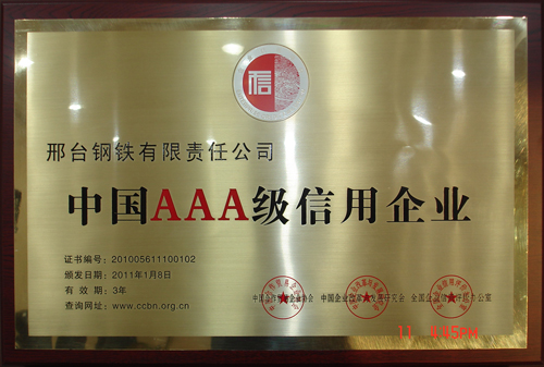 日前,在由中國合作貿(mào)易企業(yè)協(xié)會、中國企業(yè)改革與發(fā)展研究會、全國企業(yè)信用評價辦公室組織召開的中國企業(yè)科學(xué)發(fā)展論壇暨誠信表彰大會上,邢鋼被評為2010年度“中國AAA級信用企業(yè)”、公司榮獲“全國文明誠信示范單位” 稱號、董事長、總經(jīng)理袁世臻榮獲“全國優(yōu)秀誠信企業(yè)家” 稱號。